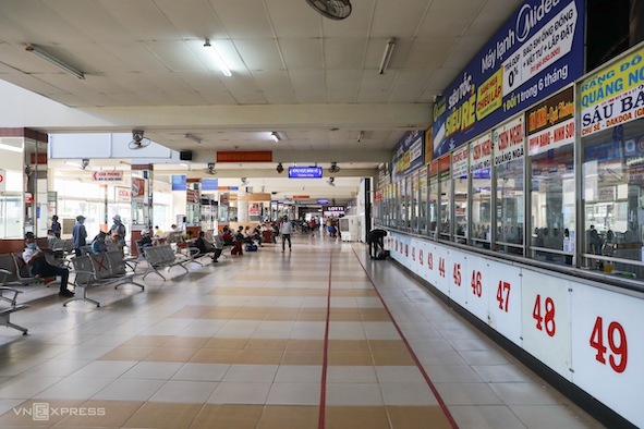 Bến xe miền Đông (quận Bình Thạnh) thời điểm cuối tuần vắng khách, các hãng xe ít người mua vé. Nhiều tỉnh lân cận như Bà Rịa - Vũng Tàu, Lâm Đồng, Bình Thuận... đã dừng xe khách đến TP HCM để ngăn Covid-19 xâm nhập sau khi thành phố lớn này xuất hiện nhiều ca nhiễm.