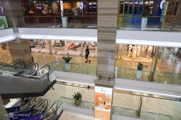 Một trung tâm thương mại trên đường Đồng Khởi (quận 1) vẫn hoạt động bình thường. Trong ngày cuối tuần, các gian hàng, nhà hàng... ở các tầng tại đây lác đác khách.