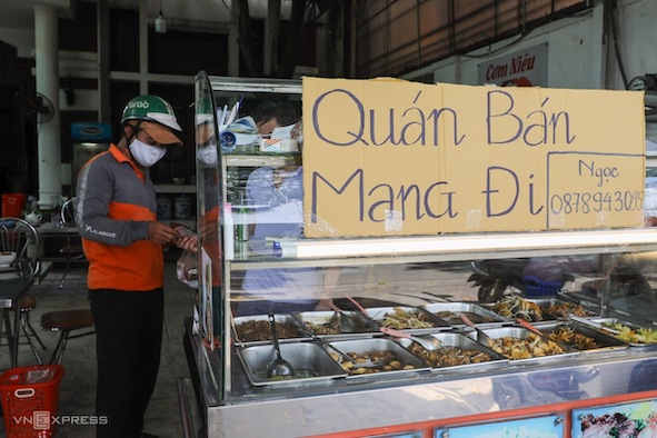 Quán cơm trên đường Hoàng Hoa Thám (quận Tân Bình) treo bảng bán mang đi, thực hiện đúng yêu cầu của chính quyền.