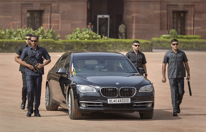 Đoàn xe tháp tùng Thủ tướng Ấn Độ gồm 2 xe BMW 7 series phiên bản chống đạn hoặc 2 xe Range Rover HSE, 6 xe BMW X5 và một chiếc xe cứu thương của hãng Mercedes Benz cùng với nhiều phương tiện khác.