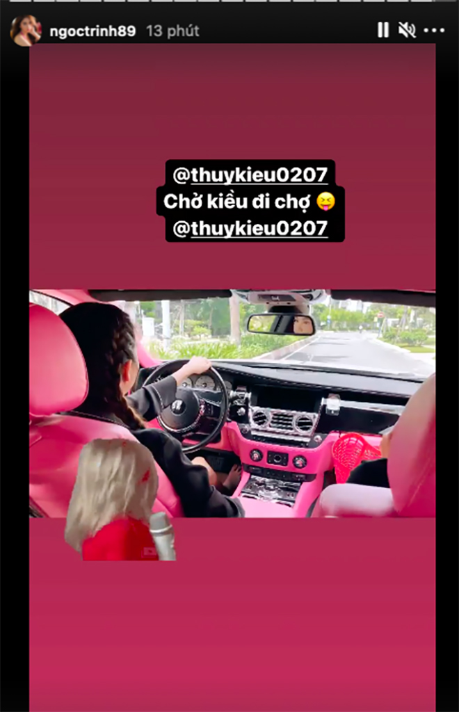 Mới đây, tài khoản Instagram của Ngọc Trinh đã đăng tải đoạn story đích thân cầm lái chiếc Rolls-Royce Ghost đưa cô trợ lý Thúy Kiều đi chợ đầy sang chảnh.
