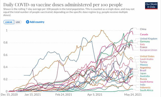 Tỉ lệ tiêm chủng theo ngày của các quốc gia G20. Nguồn: Our World in Data