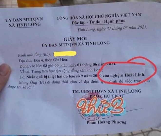 Theo đó, trong tờ giấy ghi rõ mời người dân một huyện thuộc tỉnh Quảng Ngãi đến địa điểm để nhận quà bị thiệt hại do bão số 9 năm 2020 của nghệ sĩ Hoài Linh. Chi tiết này khiến cư dân mạng tranh cãi không ngừng.