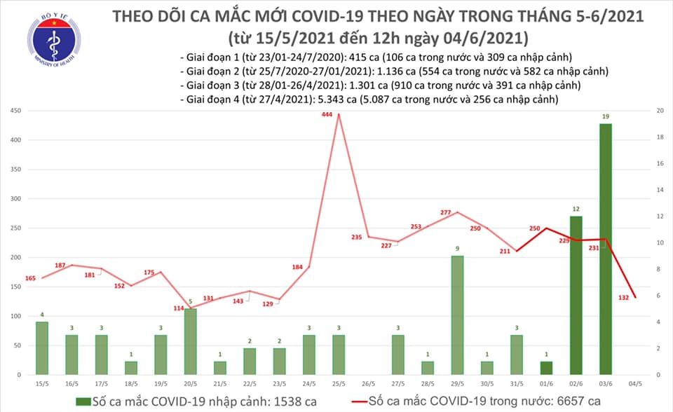 Tính đến 12h ngày 4/6, Việt Nam có tổng cộng 6.657 ca Covid-19 ghi nhận trong nước và 1.538 ca nhập cảnh. Số lượng ca mắc mới tính từ ngày 27/4 đến nay: 5.087 ca.
