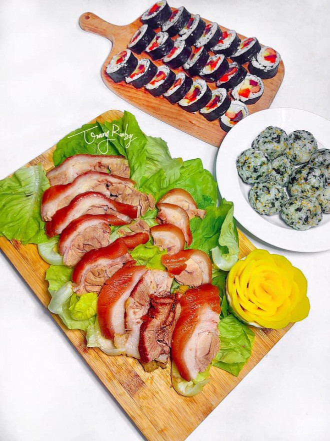 - Trong lúc hầm thịt thì tranh thủ làm kimbap, cơm trộn rong biển thêm chút dầu mè và vừng. Dùng nước hầm thịt để làm nước chấm, nếu nước chưa đặc thì có thể hòa bột bột năng vào cho sánh.