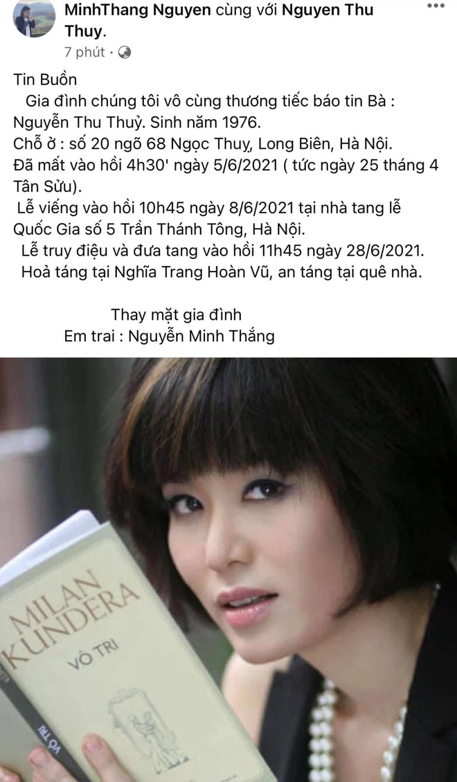 Vào rạng sáng 5/6/2021, người thân của hoa hậu Thu Thủy thông báo cô đột ngột qua đời vào hồi 4h30' hôm nay (5/6/2021), hưởng thọ 45 tuổi, khiến thông tin này khiến không ít người bàng hoàng bởi trước đó, hoa hậu Thu Thủy vẫn mạnh khỏe, chăm chỉ luyện tập thể thao, động viên mọi người giữ gìn sức khỏe trong mùa dịch.