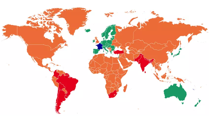 Ngoài châu Âu, phần lớn các nước (trong đó có Việt Nam) được chính phủ Pháp xếp vào danh sách "màu cam" trong sách hướng dẫn du lịch mới ra mắt ngày 4/6. Du khách đã tiêm chủng từ các nước "màu cam" không phải cách ly và không cần lý do trước khi đến Pháp. Tuy nhiên, họ cần có kết quả xét nghiệm PCR âm tính trong vòng 72 giờ trước khi đến Pháp. Với người chưa tiêm ngừa Covid-19 cần thực hiện tự cách ly 7 ngày sau khi tới Pháp.