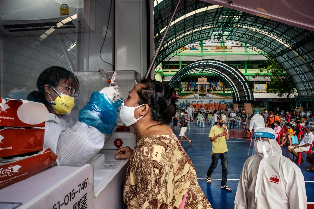 Một người phụ nữ ở khu Khlong Toey lấy dịch mũi xét nghiệm SARS-CoV-2. Ảnh: New York Times