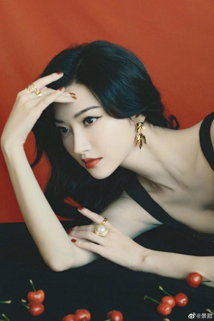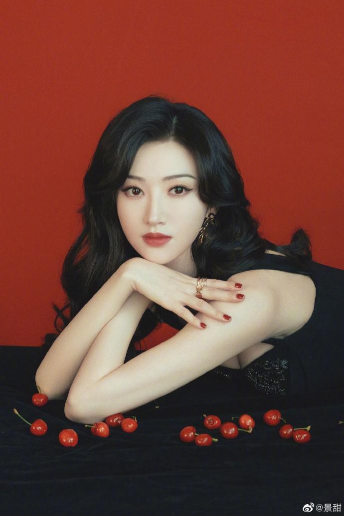 Ngày 8/6, Cảnh Điềm chia sẻ lên Weibo cá nhân bộ ảnh mới theo phong cách Hong Kong cổ điển, với hai tone màu đen - đỏ.