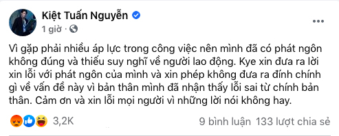 Tôi xin đưa ra lời xin lỗi với phát ngôn của ḿnh và xin phép không đưa ra đính chính ǵ về vấn đề này v́ bản thân ḿnh đă nhận thấy lỗi sai từ chính bản thân. Cảm ơn và xin lỗi mọi người v́ những lời nói không hay".