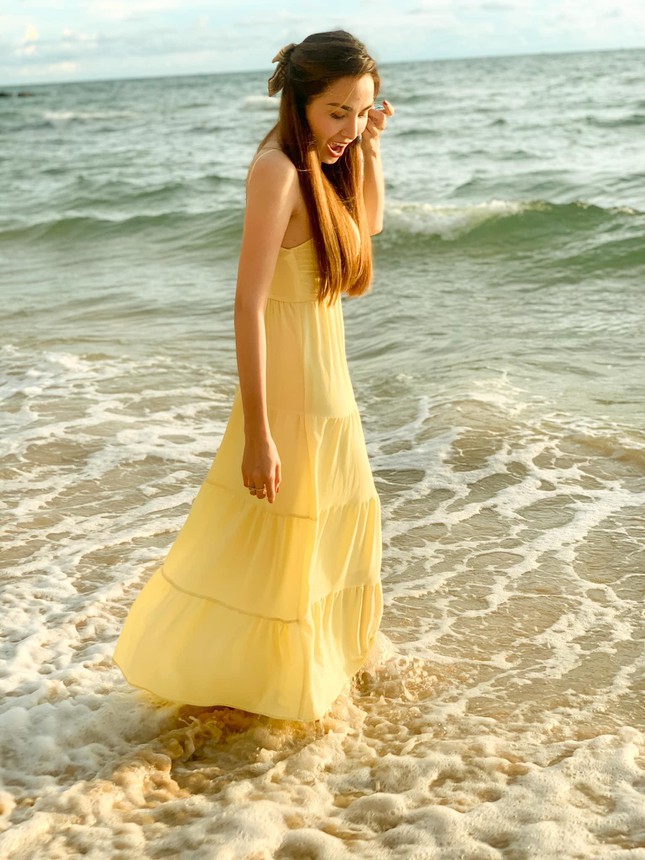 Hoa hậu Diễm Hương diện váy dài tha thướt khi dạo chơi trên bãi biển.