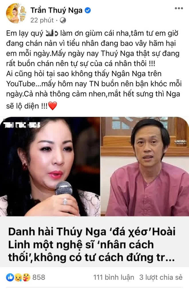 Cách đây không lâu, Thúy Nga từng thu hút nhiều sự chú ý khi có chia sẻ đầy ẩn ý, đúng lúc NS Hoài Linh đang gây tranh cãi vì lùm xùm từ thiện: "Tiền mà rách thì dán đúng cách nó còn vẫn giữ nguyên giá trị. Nhưng một khi nhân cách thối tha có xịt dầu thơm vẫn cảm thấy nặng mùi. Chính xác không cả nhà".
