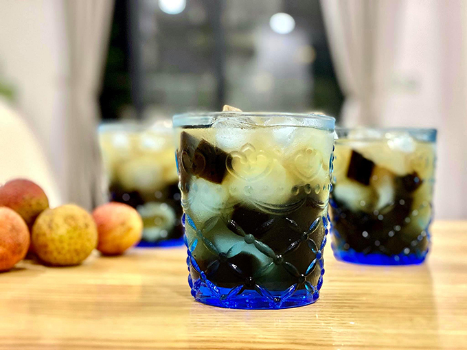 - Cuối cùng cho thêm đá viên, càng lạnh càng ngon. Đan Lê cho thêm thạch đen uống cùng. Ngoài ra, hạt chia cũng thích hợp với món này, nhai vui miệng.