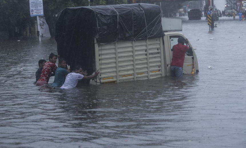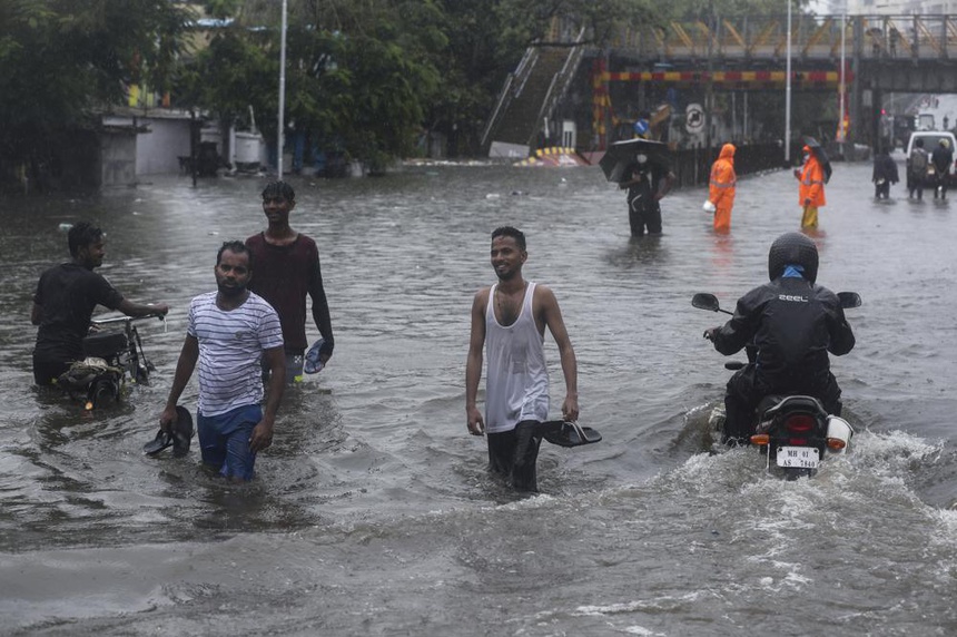 Thành phố Mumbai, Ấn Độ ghi nhận lượng mưa tới 222 mm trong vòng 12 giờ, gây ngập lụt nghiêm trọng ở nhiều khu vực, giao thông tê liệt trên nhiều tuyến đường. Ảnh: AP.