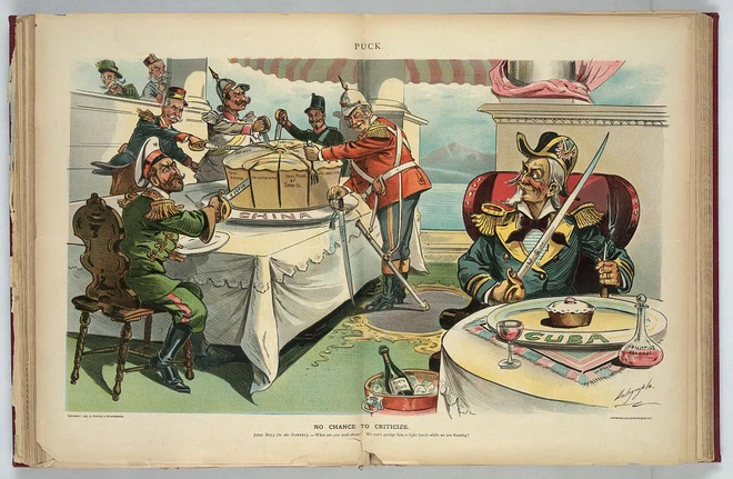 Trong bức tranh biếm họa nổi tiếng khác xuất bản bởi Keppler & Schwarzmann vào tháng 5/1898, các nhân vật tượng trưng cho Anh, Pháp, Nga, Đức và Nhật Bản cũng cầm gươm để chia chác miếng bánh khổng lồ đại diện cho Trung Quốc.