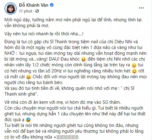 "Đúng là tui có gặp chị Sĩ Thanh trong tiệm nail của chị Diệu Nhi. Và hôm đó là một ngày vô cùng đặc biệt nên một đứa não cá vàng như tui NHỚ: Tui ngựa, dán móng tay dài nhưng vẫn hoạt động mạnh nên bị lật móng và vâng, ĐAU, đau khóc.
