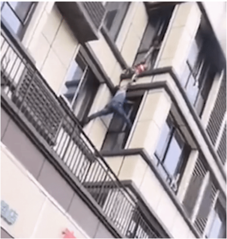 Thời điểm này, một người đàn ông bất ngờ từ tầng 1 đã nhanh thoăn thoắt leo đến gần cửa sổ của căn nhà bị cháy. Anh ta dang rộng hai chân đứng ở mép cửa sổ tầng 2, một tay bám chặt vào cánh cửa, tay còn lại đỡ đứa trẻ do người phụ nữ ở lầu 3 thả xuống.