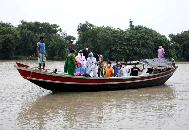 Các nhân viên y tế băng qua sông Mundeswari trên một chiếc thuyền vào ngày 21/6 để triển khai tiêm vaccine Covishield, một chế phẩm ngừa Covid-19 do Viện Huyết thanh Ấn Độ sản xuất.