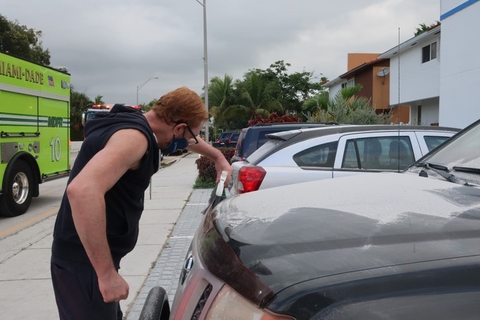 Một người đàn ông sống gần chung cư sập lau bụi trên ô tô sáng 24/6. Ảnh: WLRN.