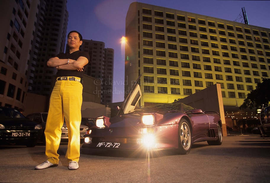 Doãn Quốc Câu đứng bên cạnh chiếc siêu xe Lamborghini Diablo màu tím ưa thích ở Macau năm 1998.