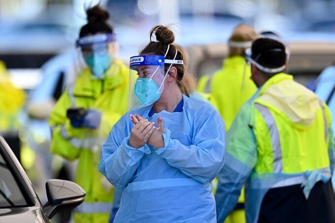 Nhân viên y tế xét nghiệm Covid-19 tại một điểm xét nghiệm nhanh qua ô tô ở bệnh viện St.Vicent tại Sydney hôm 27/6. Ảnh: AFP.
