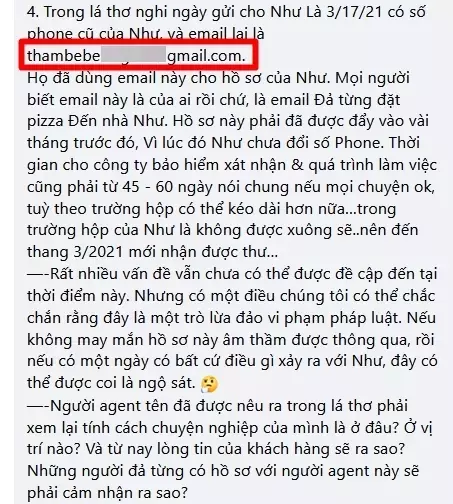 Dùng những từ ngữ khó nghe nói về đối phương, Quỳnh Như cũng công khai email của người liên hệ với công ty bảo hiểm được phía họ cung cấp, có tên Thắm Bebe.
