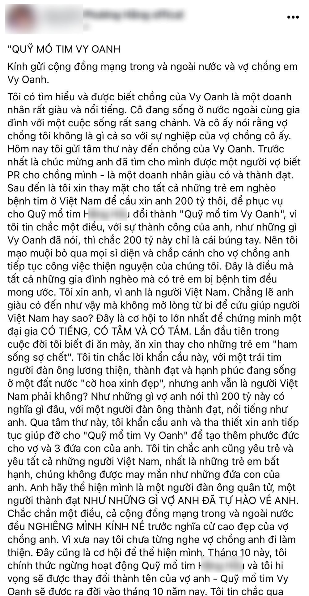 Mới đây, bà Phương Hằng gây bất ngờ khi đột ngột viết tâm thư với nội dung "xin" vợ chồng ca sĩ Vy Oanh 200 tỷ để tiếp tục duy trì quỹ mổ tim. Trước đó, quỹ hoạt động thiện nguyện được lập ra bởi vợ chồng doanh nhân Đại Nam. Tuy nhiên do nhiều ồn ào của dư luận nên nữ đại gia đã tuyên bố đóng quỹ.