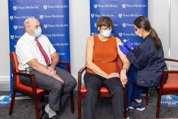 Bà Kariko và ông Weissman vào ngày tiêm vaccine Covid-19. Ảnh: Penn Medicine.