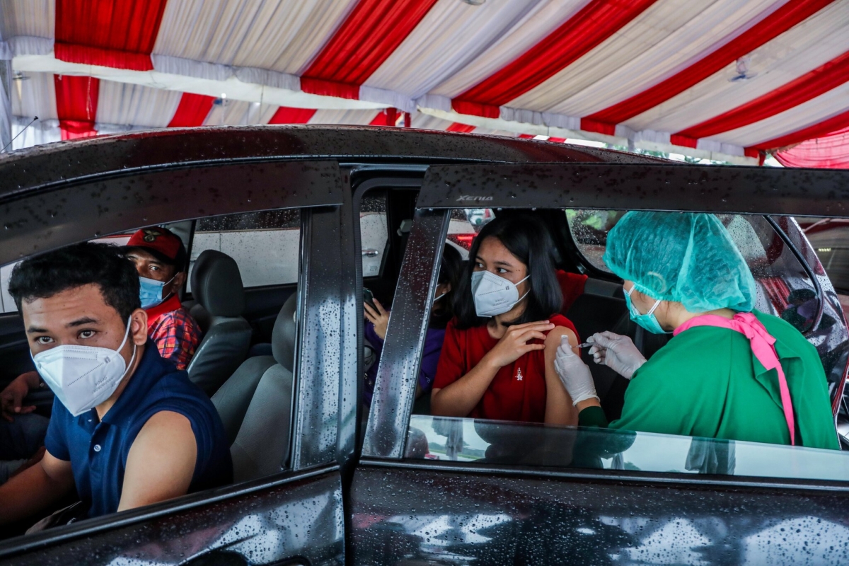 Một điểm tiêm vaccine dành cho người lái xe qua ở Medan, Indonesia. Ảnh: EPA