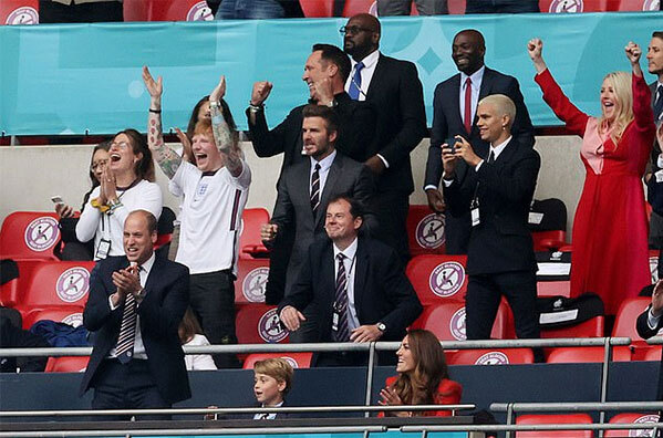 Trong khu vực VIP, Becks và cậu hai Romeo ngồi ngay sau nhà Cambridge, cách một hàng ghế. Cùng hàng với bố con Becks là vợ chồng ca sĩ Ed Sheeran (áo trắng cạnh Becks). Ngay sau lưng tiền vệ một thời của MU là vợ chồng cựu thủ môn David Seaman.