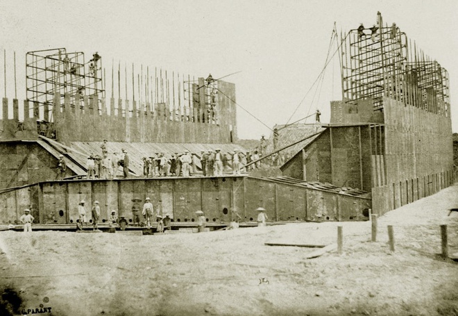 Ảnh của Charles Parant in trên giấy bạch đản chụp cảnh xây dựng bến tàu nổi ở Sài Gòn tháng 5/1864. Ảnh này thuộc bộ sưu tập của Trung tâm Lưu trữ Hải ngoại.