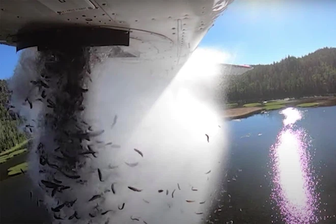 Mời đây, trong đoạn video "thả mưa cá" hoành tráng, các chuyên gia về động vật hoang dã đã chuẩn bị những xô cá — cụ thể hơn là các loại "cá giống" hoặc cá con dài từ 2.5 cm đến 8 cm. Sau đó, lượng cá này được rải đều từ máy bay theo từng nhóm trên nhiều khu vực khác nhau cho đoạn clip cho thấy các phi công đã thả chuẩn xác cá xuống từng chiếc hồ trên núi ở khu vực bang Utah, Mỹ, khiến nhiều người nước này tấm tắc khen không ngớt