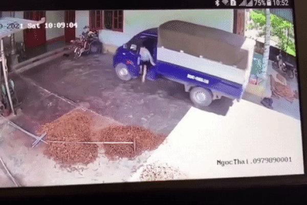 Theo hình ảnh trong clip, trong lúc người lớn đang mải mê nói chuyện, bé trai chừng 8-9 tuổi đã lẻn vào chiếc xe tải không khóa cửa đang đỗ ở sân nhà. Ngay sau đó, chiếc xe bất ngờ trôi tự do, mất kiểm soát.