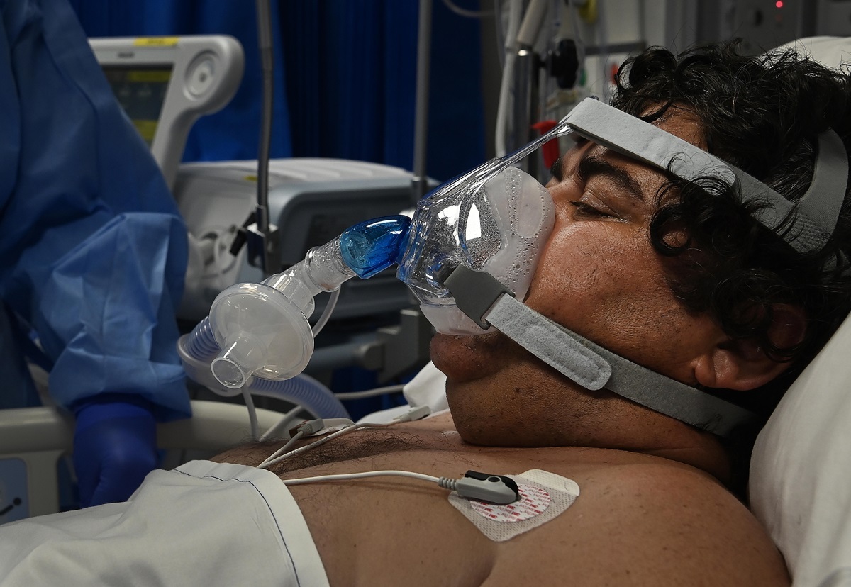 Một bệnh nhân Covid-19 được điều trị trong bệnh viện St Vincent's ở Sydney. Bệnh nhân này chỉ có thể thở nông, tức tình trạng hơi thở ngắn, nhanh, gấp gáp, đôi khi khó thở, có cảm giác như bị đè chặt vùng ngực, gây hô hấp khó khăn.