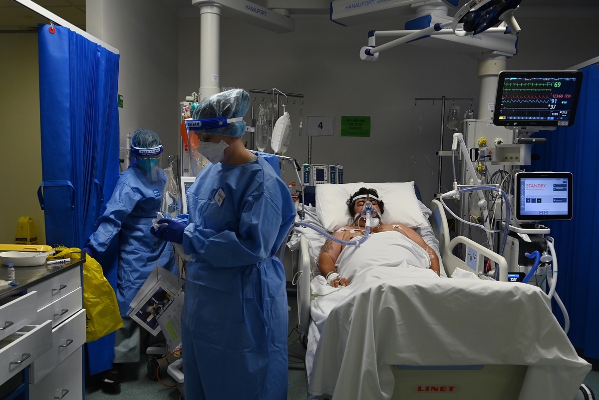 Hai nhân viên y tế chăm sóc bệnh nhân Covid-19 trong phòng chăm sóc tích cực.