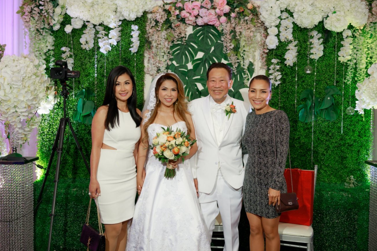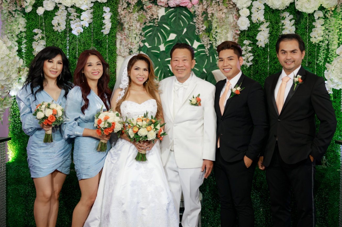 Hai ca sĩ Trizzie Phương Trinh (ngoài cùng bên trái) và Kristy làm phù dâu trong đám cưới bạc của Lê Quang - Cam Thơ.