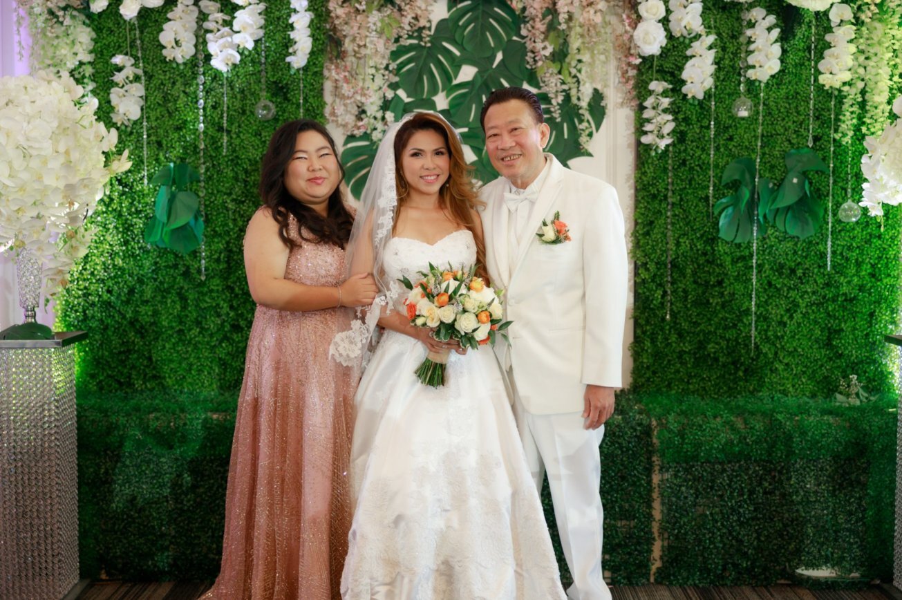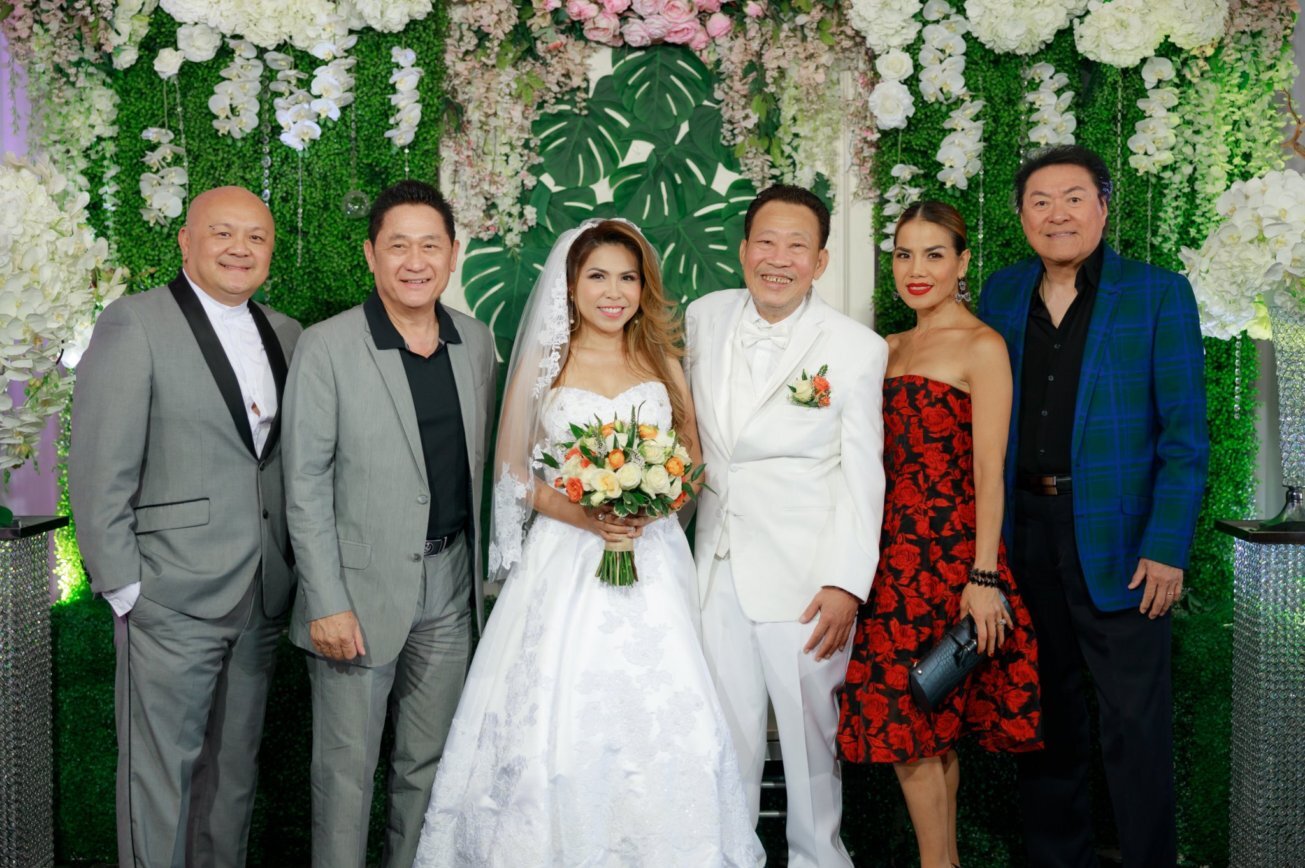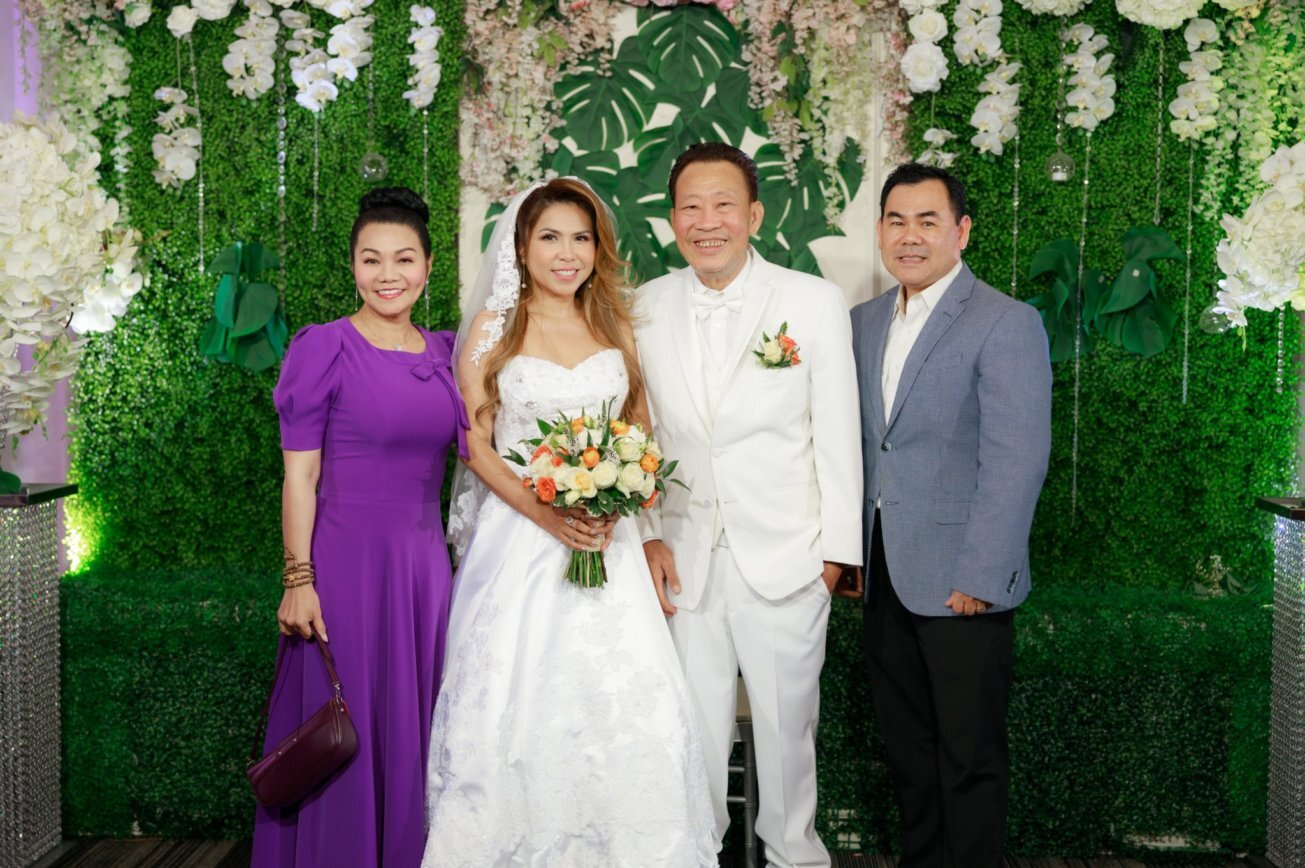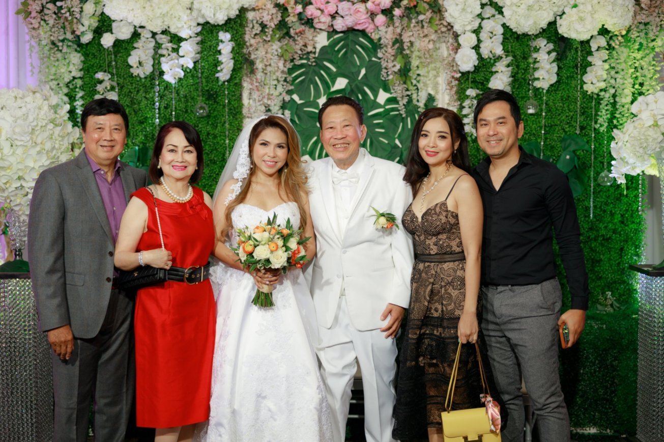 Nhạc sĩ Lê Quang và vợ - ca sĩ Cam Thơ - diện trang phục cô dâu, chú rể trong tiệc mừng đám cưới bạc tổ chức tại khu Bolsa, bang California, Mỹ. Đôi vợ chồng đã gắn bó gần 3 thập kỷ, cùng nhau trải qua nhiều vui buồn, biến cố trong cuộc sống.