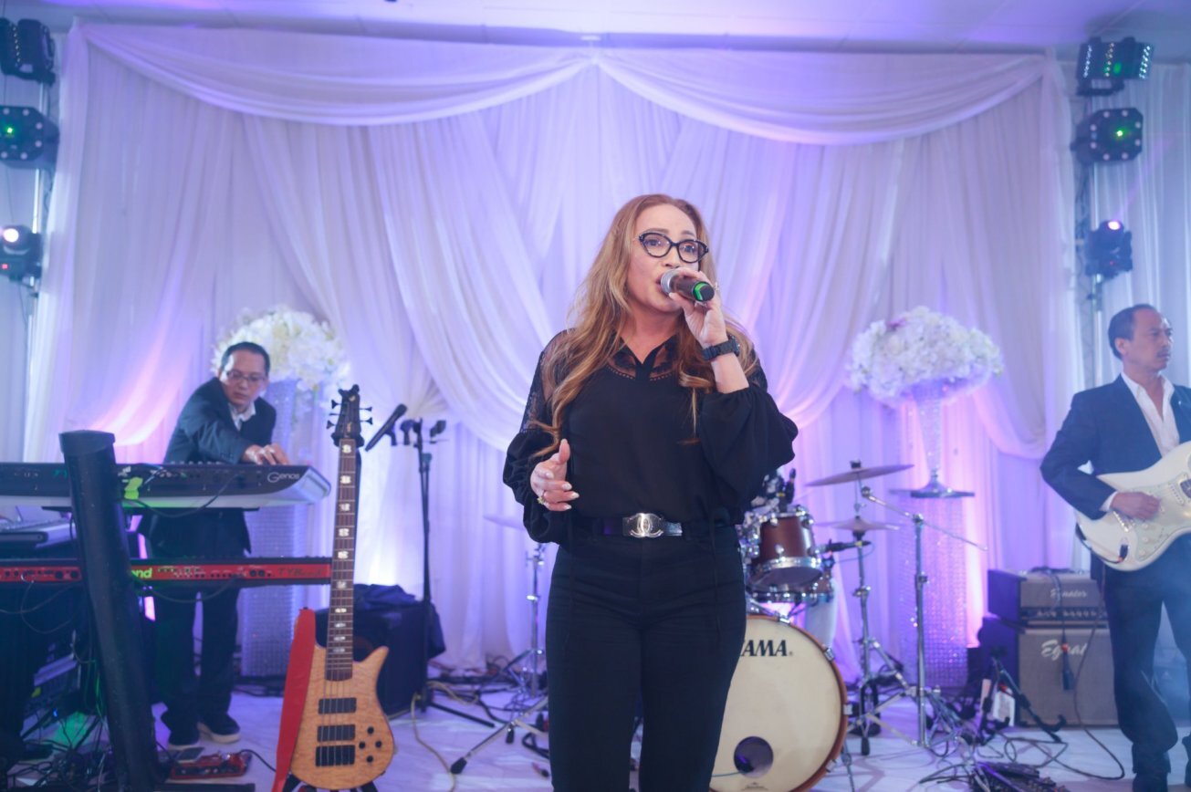 Ca sĩ Thanh Hà biểu diễn một bản tình ca, góp vui trong buổi tiệc.