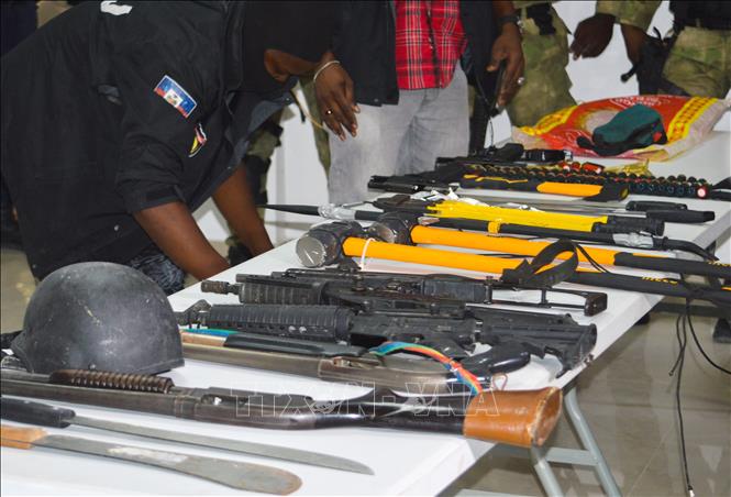 Cảnh sát trưng bày số vũ khí thu giữ của các nghi phạm ám sát Tổng thống Haiti Jovenel Moise, trong cuộc họp báo tại Port-au-Prince, ngày 8/7/2021. Ảnh: THX/TTXVN
