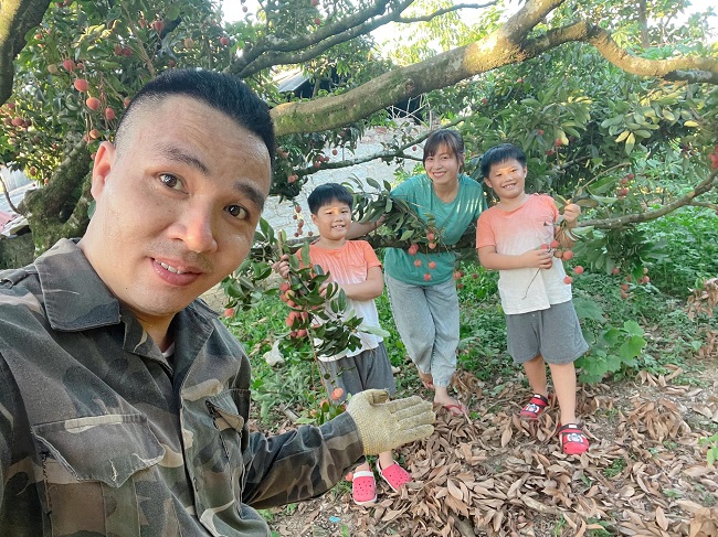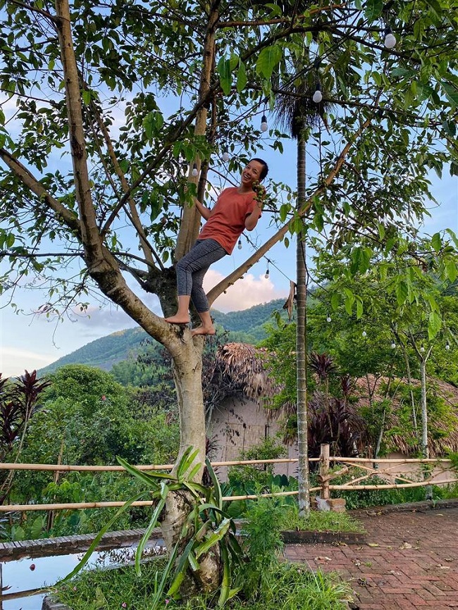 Khi về quê, Hoàng Linh mặc áo phông cùng quần nỉ thuận tiện cho việc thăm thú vườn tược cùng cả nhà. Sự giản dị, mộc mạc của Hoàng Linh khi ở nhà khiến mọi người thích thú.