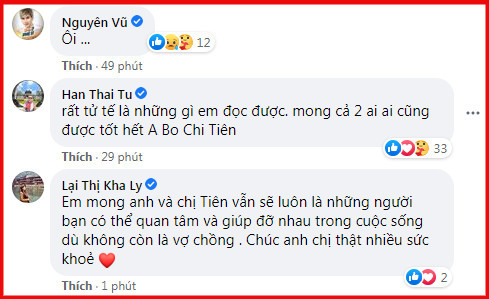 Nhiều sao Việt đã bày tỏ quan điểm của mình trước thông tin này. Ca sĩ Nguyên Vũ cảm thán: "Ôi", Hàn Thái Tú: "Rất tử tế là những gì em đọc được. Mong cả hai ai ai cũng được tốt hết".