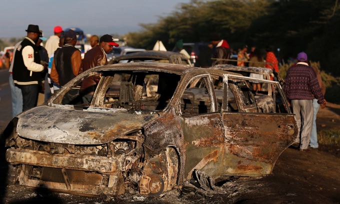 Hàng chục người tập trung xung quanh một xe bồn bị lật sau tai nạn gần thị trấn Malanga, tỉnh Siaya, Kenya, để tìm cách thu gom xăng rò rỉ hôm 17/7. Xe bồn đột ngột bắt lửa và phát nổ, khiến nhiều người chết và bị thương.
