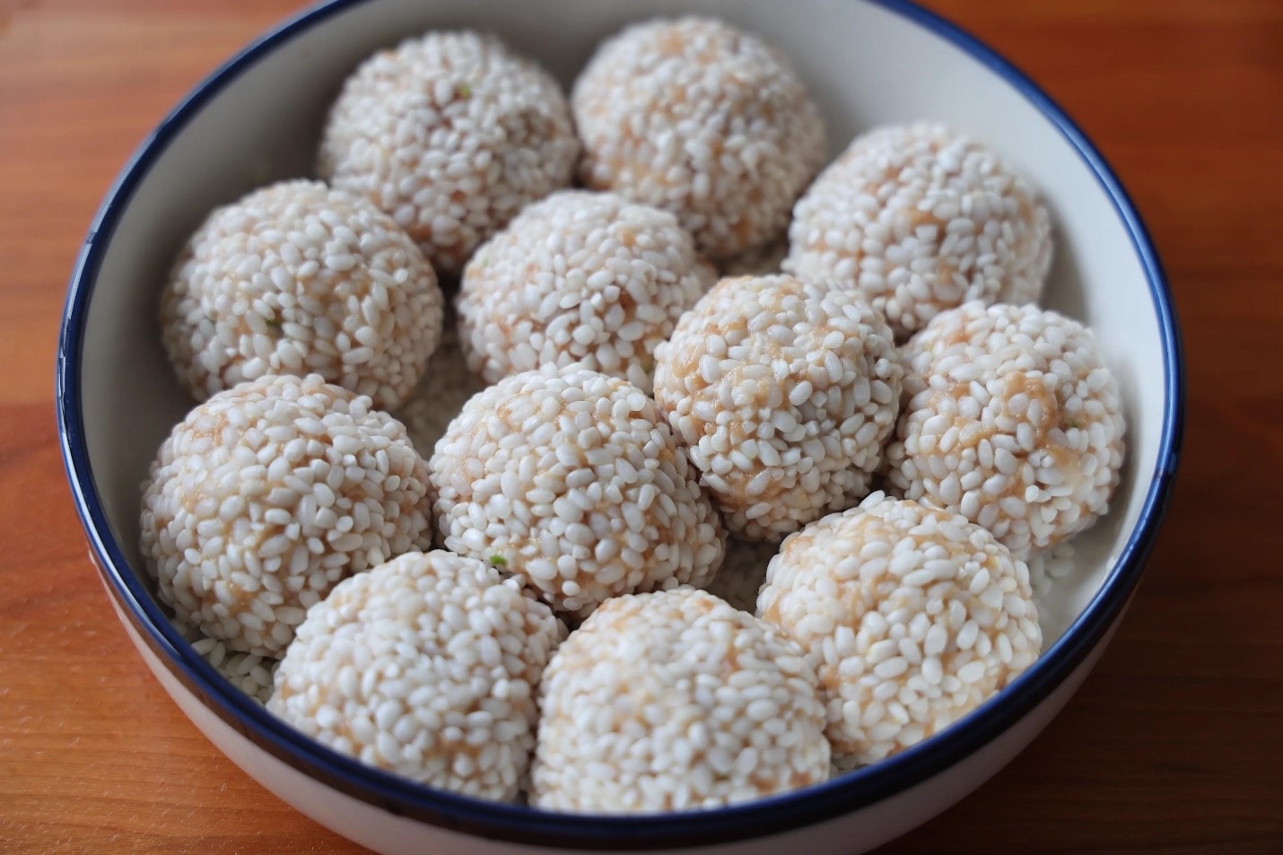 5. Lăn miếng thịt viên vào gạo nếp sao cho gạo phủ đều