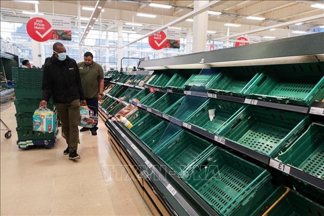 Kệ hàng hóa trống trơn tại siêu thị Tesco ở London, Anh, trong bối cảnh dịch COVID-19 lan rộng. Ảnh tư liệu: THX/TTXVN