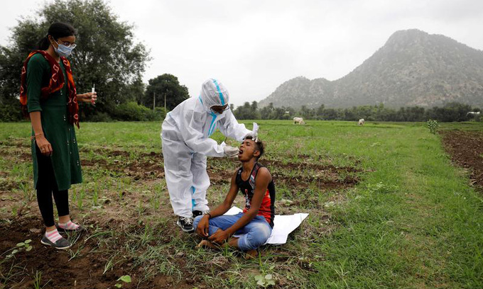 Nhân viên y tế lấy mẫu xét nghiệm nCoV cho người dân tại huyện Banaskantha, bang Gujarat, Ấn Độ, hôm 23/7. Ảnh: Reuters.