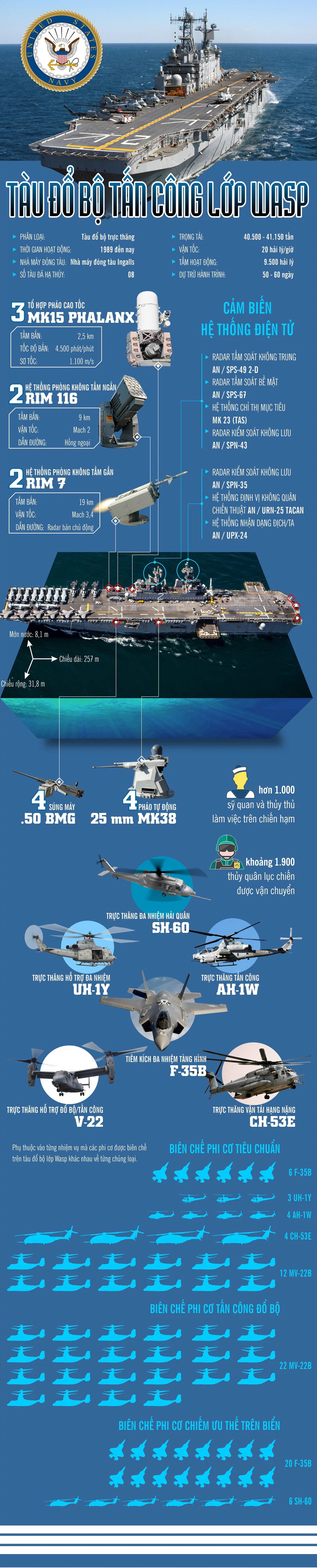 Với năng lực tác chiến của máy bay thế hệ thứ 5, tàu đổ bộ lớp Wasp hoàn toàn có thể tung những đòn kinh hoàng vào đối phương. Khi thực hiện nhiệm vụ tấn công, cơ cấu trên thay đổi trên tàu Warp gồm 42 CH-46 Sea Knight hoặc 22 MV-22 Osprey.