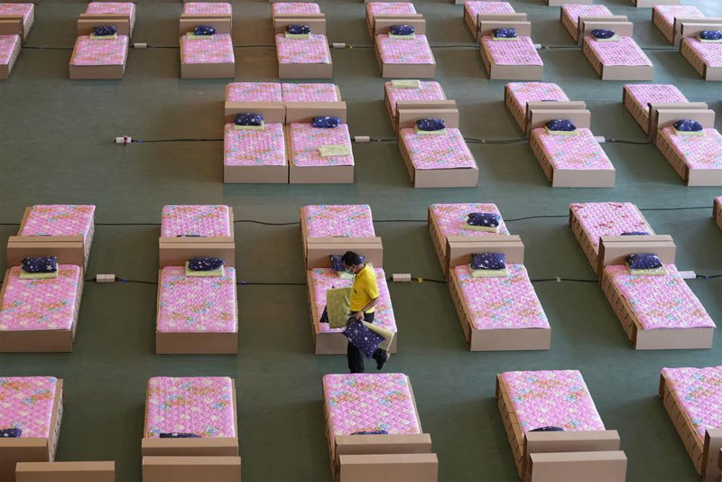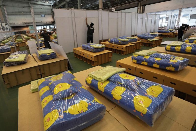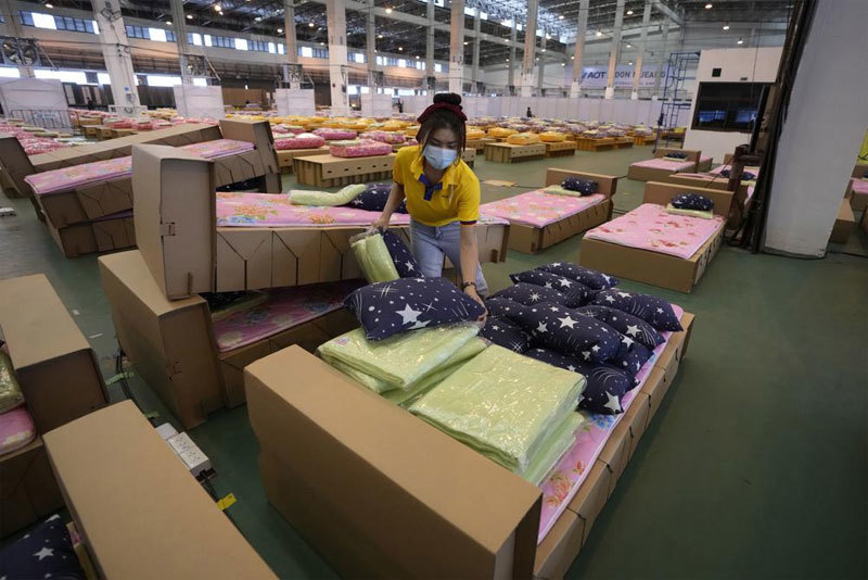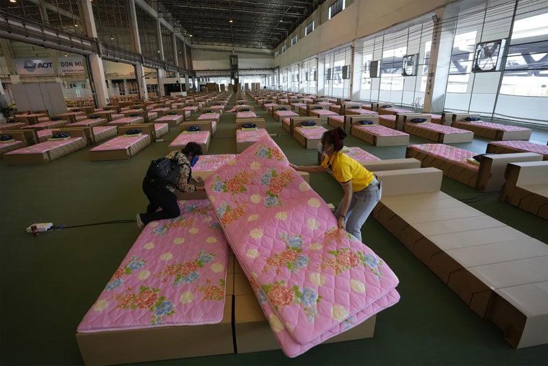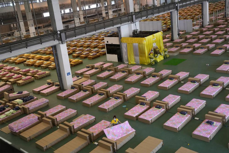 Theo hãng tin AP, các công nhân đã chạy đua với thời gian để thiết lập bệnh viện tại sân bay Don Mueang. Tổng số 1.800 giường bằng bìa cát-tông đã được dựng lên, được trang bị nệm và gối để sẵn sàng đón bệnh nhân.