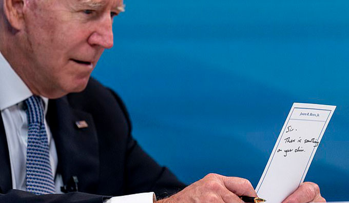 Thông thường, các trợ lý của ông sẽ chỉ can thiệp khi bắt đầu nhận các câu hỏi từ báo chí nhằm tránh nguy cơ đi sai kịch bản. Ban đầu, người ta không biết tờ ghi chú ở đầu chương trình ông Biden nhận được là gì. Tuy nhiên, khi ông Biden sử dụng chính tờ giấy này để ghi nội dung cuộc họp và giơ nó lên, cả thế giới biết ông được nhắc vì "có thứ gì đó trên cằm".