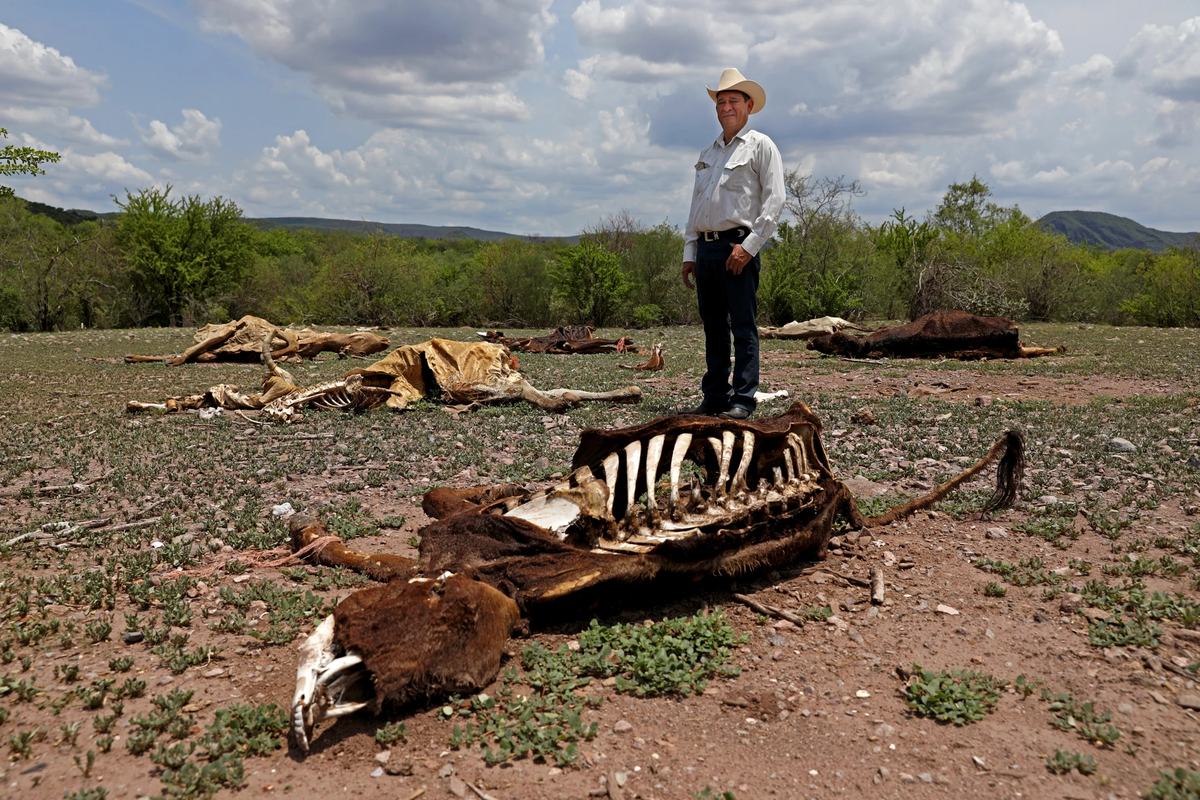 Ông Marco Antonio Gutierrez, một chủ trang trại ở bang Sonora, Mexico, đứng giữa những xác gia súc chết đói. Ảnh: Los Angeles Times.