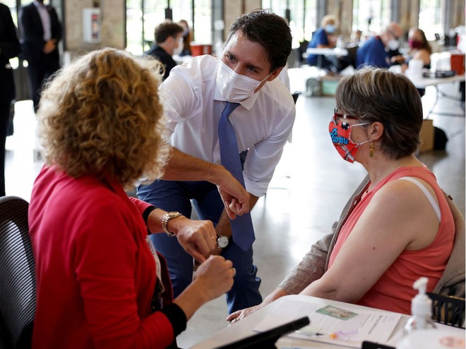 Thủ tướng Canada Justin Trudeau tới thăm một địa điểm tiêm chủng ở bang Ontario hồi đầu tháng 7. Ảnh: Reuters.
